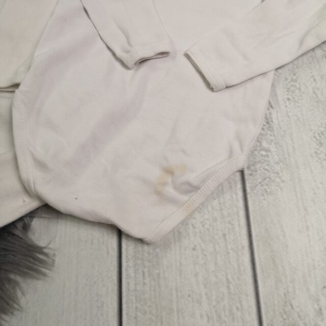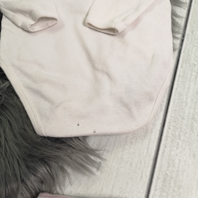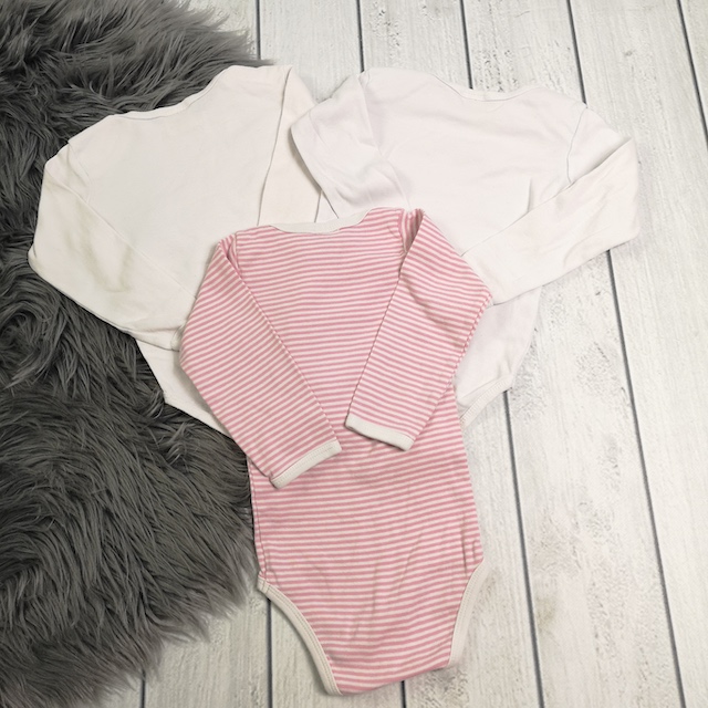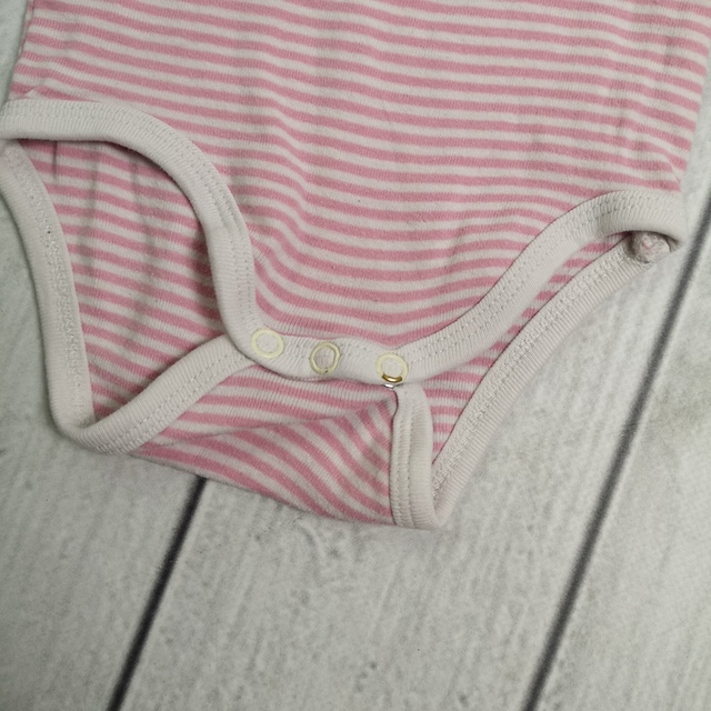 Info: Beim gestreiften Body löst sich die Farbe der Druckknöpfe, ein weißer Body hat hinten eine Verfärbung und der andere weiße Body hat an den Druckknöpfen kleine Löcher. (s. Detailbilder)