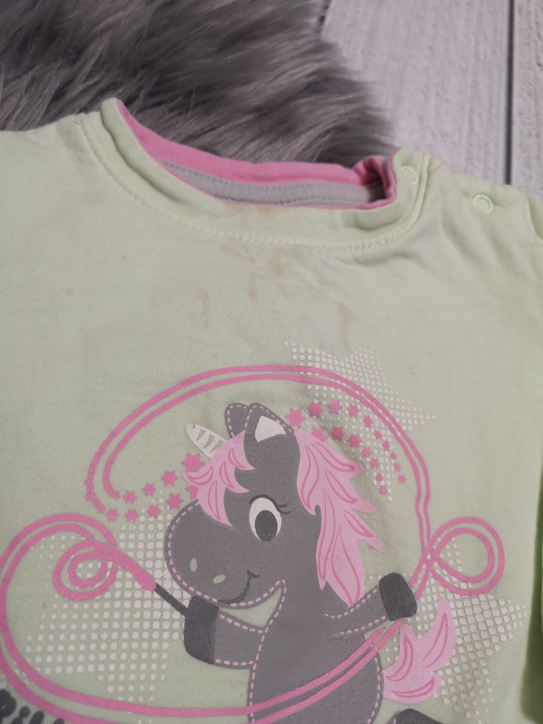 Mangel: Der Pullover hat vorne und hinten kleine Verfärbungen und Flecken.