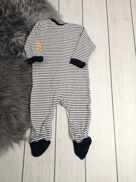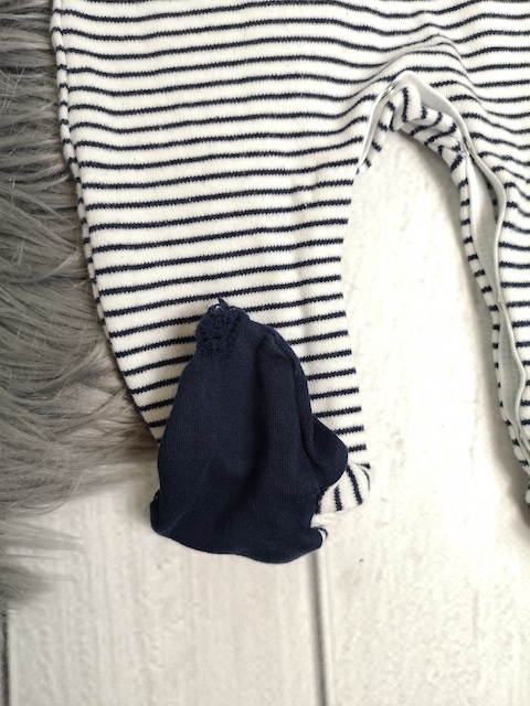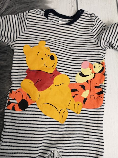 Info: Der Aufdruck ist leicht rissig und der Stoff an den Füßen hat Löcher. (s. Detailbilder)